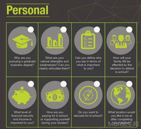 攻讀商學(xué)院可能對你的個(gè)人生活和發(fā)展產(chǎn)生重要的影響,比如性格發(fā)展、時(shí)間分配、財(cái)務(wù)狀況甚至是家庭等各個(gè)方面。所以,從個(gè)人發(fā)展的角度來講,你需要仔細(xì)思考以下8個(gè)問題: