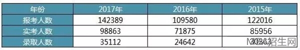 從近三年招錄人數(shù)分析,報(bào)考人數(shù)大致以2萬(wàn)左右遞增,實(shí)考人數(shù)緊跟上升,錄取人數(shù)穩(wěn)定在3萬(wàn)人上下浮動(dòng)。從長(zhǎng)遠(yuǎn)數(shù)據(jù)看,每隔2-3年錄取人數(shù)會(huì)有一次躍升。從報(bào)考趨勢(shì)可以看出,報(bào)考人數(shù)逐年上漲,MBA等管理類聯(lián)考報(bào)考項(xiàng)目熱度不減。