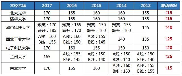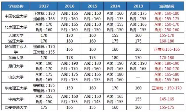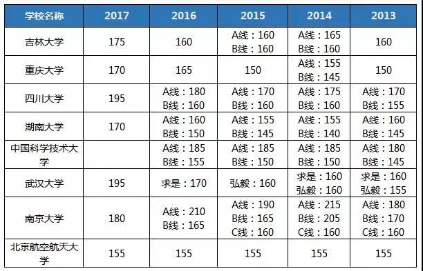 分析:這類分?jǐn)?shù)線沒什么規(guī)律,比如北航,簡(jiǎn)直屬于風(fēng)雨不動(dòng)安如山,五年來毫無變化;比如中國(guó)科學(xué)技術(shù)大學(xué)去年的分?jǐn)?shù)線是基礎(chǔ)分?jǐn)?shù)線125,某項(xiàng)復(fù)試分?jǐn)?shù)線是205;比如南京大學(xué)B線從13年的170漲到205又降到165再到變不見,真的是,院校大佬,你開心就好。