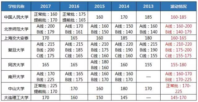 分析:這類院校從近五年的分?jǐn)?shù)線來看,總體波動(dòng)稍微有點(diǎn)大,波動(dòng)幅度在25分以上,其中北師大A線波動(dòng)超過50分。但是綜合其他院校來看,近五年分?jǐn)?shù)線的最高值應(yīng)該就是極值了。