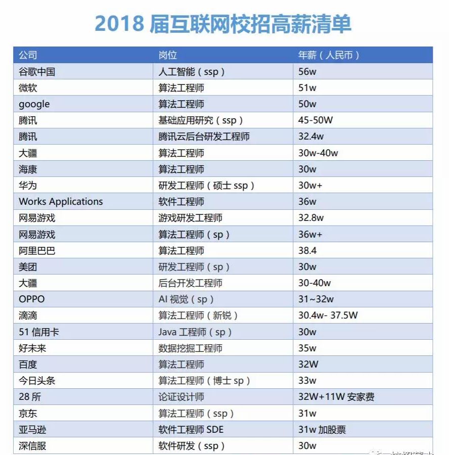 一份2018屆互聯(lián)網(wǎng)校招高薪清單近日在網(wǎng)絡(luò)流傳,清單顯示了眾多知名互聯(lián)網(wǎng)企業(yè)技術(shù)類崗位的年薪水平,動(dòng)輒30萬元以上的出價(jià)。