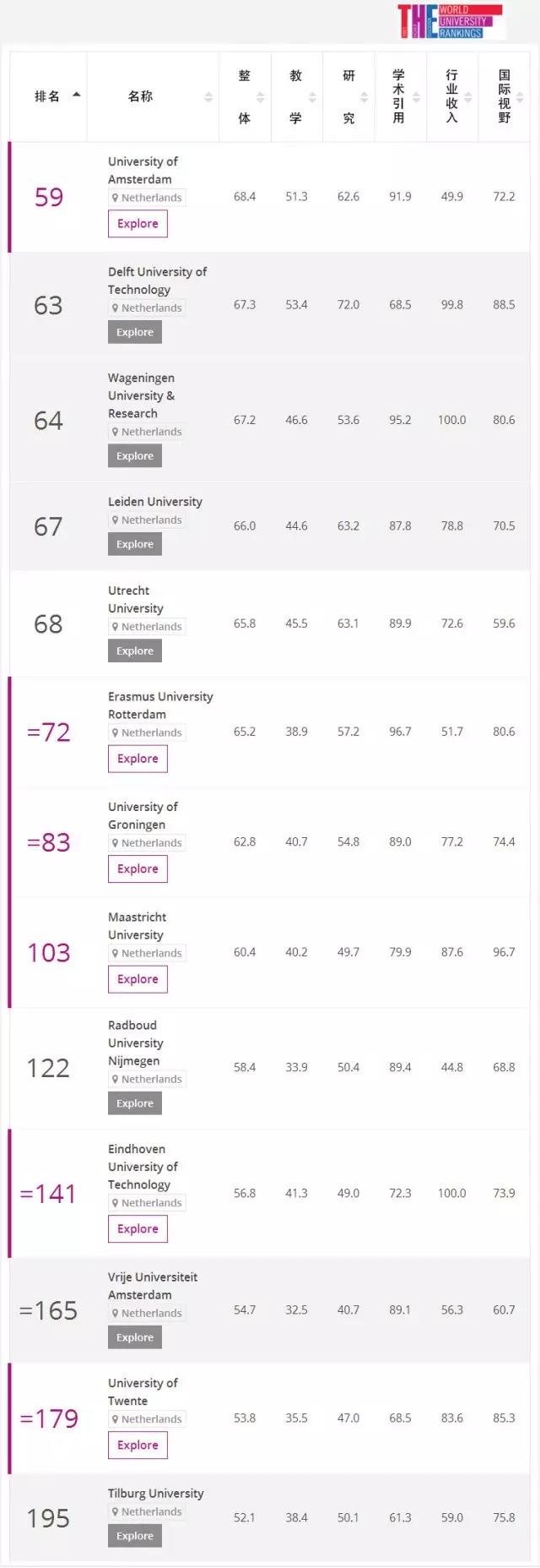 參加全球大學(xué)排名的荷蘭研究型大學(xué)常年表現(xiàn)優(yōu)異。在今年《世界大學(xué)排名》中,更以荷蘭13所研究型綜合大學(xué)全部入選世界200強、歐洲100強的驕人成績,再次印證了業(yè)內(nèi)對荷蘭擁有“全球最具價值高等教育體系”的贊譽。