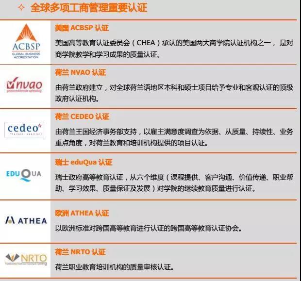 BSN 荷蘭商學(xué)院擁有美國 ACBSP、荷蘭 NVAO、瑞士 eduQua、歐洲 ATHEA 等多項全球工商管理重要認證;2016 年 2 月,被英國著名《CEO》雜志評選為歐洲一流工商管理學(xué)位項目。