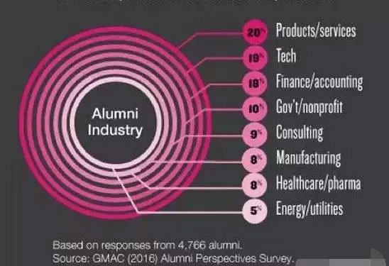 產(chǎn)品/服務(wù)、技術(shù)、金融/會計是三大熱門行業(yè),但并沒有出現(xiàn)一邊倒的行業(yè)井噴現(xiàn)象,即使最熱的產(chǎn)品/服務(wù)行業(yè)供職的比例也不超過20%;政府/非營利組織、咨詢、制造業(yè)、保健/醫(yī)藥、能源/公共事業(yè)五大行的校友則各自穩(wěn)定在5%-10%。