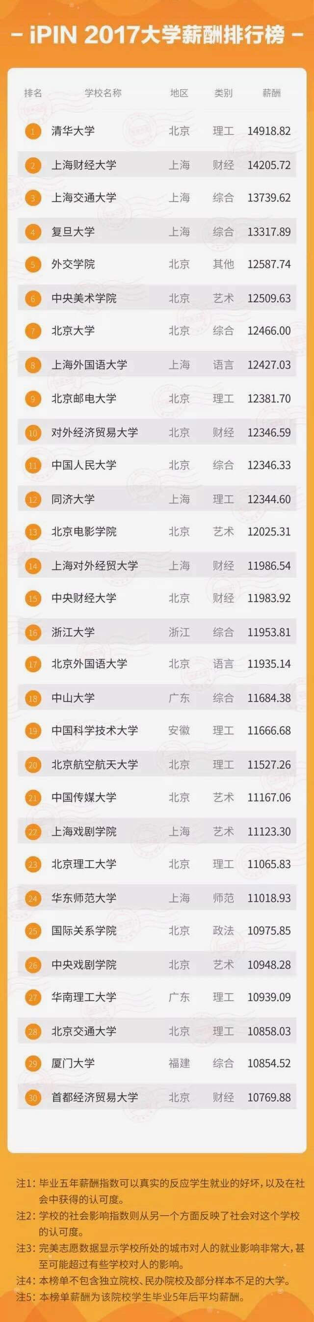 附贈一份薪酬數(shù)據榜單(此數(shù)據榜單來源于IPIN公司,由iPIN公司依據高校畢業(yè)生五年薪酬數(shù)據計算。)