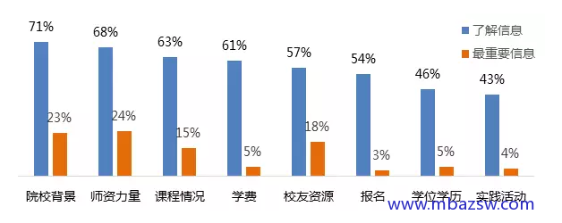 學員在擇校時主要會了解院校背景、師資力量、課程情況、學費、校友資源及報名流程;師資力量和院校背景是學員考量的最重要因素,其次是校友資源及課程情況。
