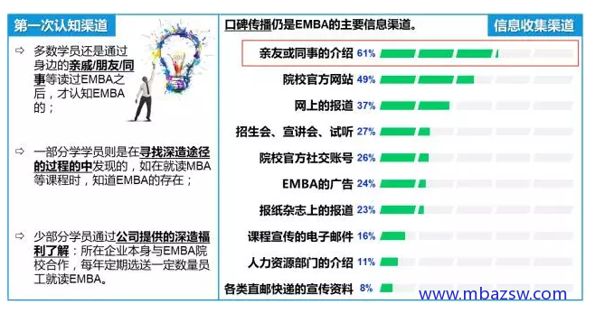 口碑,特別是來自讀過EMBA校友的評價,會影響多數(shù)學員對EMBA的認知。網(wǎng)站和網(wǎng)絡傳播也很重要。