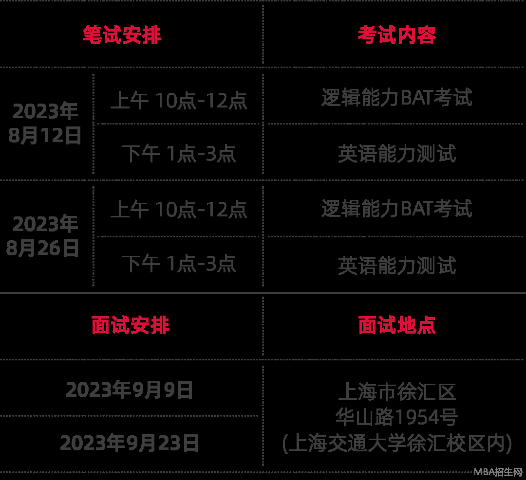 上海交大-KEDGE國際在職MBA項目組將于2023年8、9月份舉行本項目2023年度報名截止之前的倒數(shù)第二批筆、面試工作。請有報名計劃的同學,抓緊報名,合理規(guī)劃本年度的學習計劃。