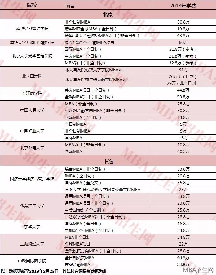 2019年各院校MBA最新學(xué)費(fèi)(上海、北京)