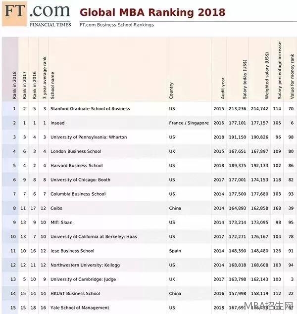 1月29日,英國《金融時(shí)報(bào)》( Financial Times )發(fā)布“全球MBA百強(qiáng)榜”( Global MBA Ranking 2018 ),斯坦福商學(xué)院、INSEAD、沃頓商學(xué)院摘得前三甲。 進(jìn)入排行榜的中國學(xué)校共有7所,分別為今中歐國際工商學(xué)院、香港科技大學(xué)商學(xué)院、香港大學(xué)、上海交通大學(xué)安泰經(jīng)管學(xué)院、復(fù)旦大學(xué)管理學(xué)院、中國人民大學(xué)商學(xué)院、香港中文大學(xué)商學(xué)院。
