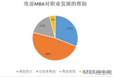 調(diào)查顯示,31%MBA學(xué)員認(rèn)為攻讀MBA對其職業(yè)發(fā)展幫助很大,48%的學(xué)員認(rèn)為攻讀MBA對其職業(yè)發(fā)展比較有幫助,僅有17%的學(xué)員認(rèn)為對其幫助有限。