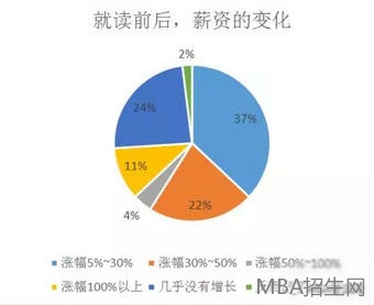 所有被調(diào)查人群中,有37%的人在攻讀MBA后薪酬漲幅在5%~30%之間,22%的人薪酬漲幅在30%~50%之間,同時也有一定比例的人認(rèn)為攻讀MBA后薪酬幾乎沒有增長,這部分人數(shù)占比達(dá)24%。也有一小部分人在攻讀MBA后薪酬漲幅在100%以上,占比達(dá)11%;漲幅在50%~100%之間的人數(shù)較少,占比4%