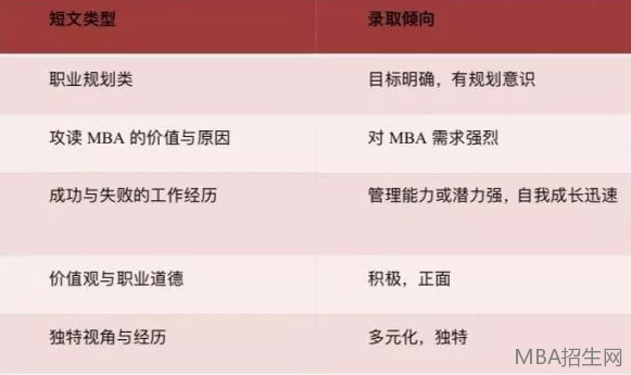 如人大17年申請短文“簡要概述你的短期和長期職業(yè)規(guī)劃,你認(rèn)為人大MBA項目將對你實現(xiàn)規(guī)劃產(chǎn)生什么作用”;復(fù)旦19年“如果您被復(fù)旦MBA錄取,請具體談?wù)勀膫€人學(xué)習(xí)規(guī)劃”;廣東外語外貿(mào)17年“我對廣外MBA “微笑”(SMILE)價值觀的理解”;等等。
