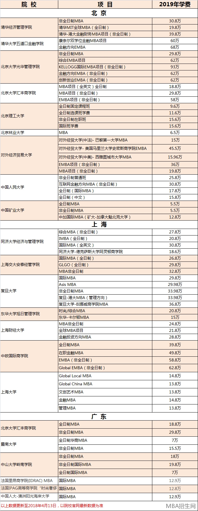 2019年各大MBA院校MBA學費匯總,陸續(xù)更新中。